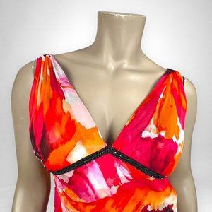 Melinda Eng midi sleeveless dress with a multicolor floral pring. Deep v-neck in front and back. Embellished band with black beads under bust. Cascading ruffles on back of skirt. No stretch. Zip closure on back. Fully lined.