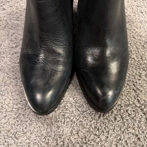 * Characteristics: Leather block heeled boots, distressed leather accents, lace up side detail