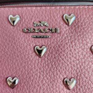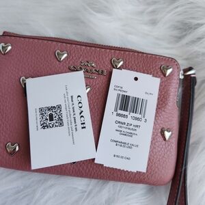 Elegant Coach wristlet in mauve with silver heart details. Perfect for a chic look.