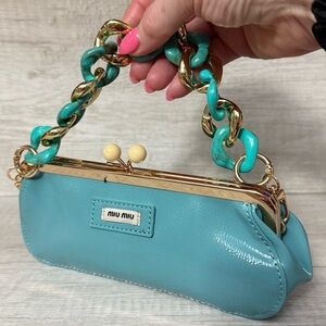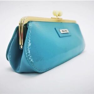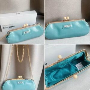 Miu Miu Parfumes collection - This elegant tiffany blue colored clutch features a shiny textured material that resembles patent leather. It has an elongated rounded shape and is secured with a gold-colored metal frame and kiss-lock clasp closure, making it a stylish choice for carrying essentials. Includes gold hardware cross body straps. Cute clutch, it does fit my iPhone 16 pro max. Includes box and strap.