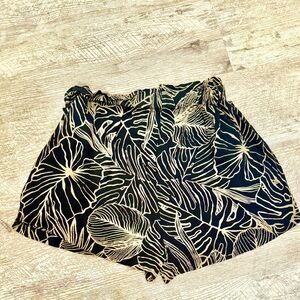 Tabgs: shorts, print, leaf, lightweight, vacation, travel, paper bag waist, elastic waist, loose, relaxed fit, loose fit, cooling, flowy, breezy, natural, black, cream, monochromatic, banana leaf, pool, beach, boho, bohemian, hippie, mom, teen, tween, sister, daughter, girlfriend, casual, minimalist, natural