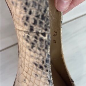 Step out in style with these elegant leather snakeskin patterned women's 5 inch heels. Perfect for any occasion, these shoes feature a sophisticated black and cream design. Platform. Very good Preloved condition.