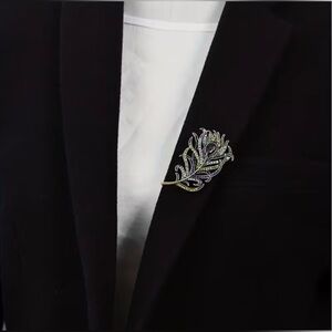 Peacock Feather Rhinestone Encrusted Brooch Modern New Gold Tone