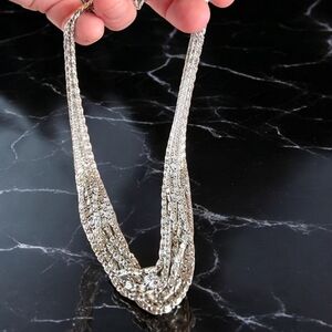 Stunning vintage Sarah Coventry multi-strand stamped necklace featuring layers of bright silver-tone textured chains that drape beautifully around the neckline.
