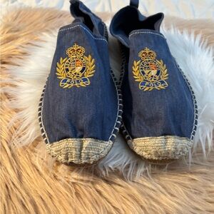Stylish blue espadrilles with embroidered crest. Comfortable and casual design.