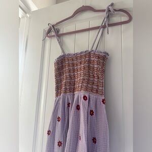 Maxi dress featuring floral embroidery. Pattern is similar to the Dahlia Free People dress. It’s a size small (no size tag on dress). Top is smocked and has stretch. Shoulder straps are adjustable. Dress is not lined.
