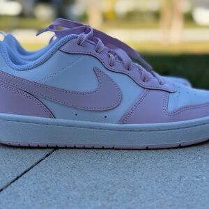 Light mint or miss green suede sneakers with mesh accents. White midsole and gum outsole. Classic Nike style.