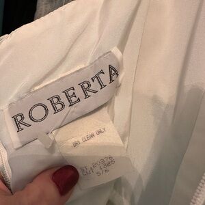 Chic strapless dress by Roberta Bridal. Features a white base with a blue accent. Perfect for elegant occasions like Prom, Cocktails, stylish evening outing and etc.