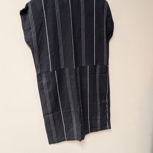 Stylish black mini dress. Features white stitching. Sleeveless and versatile.