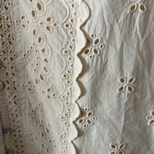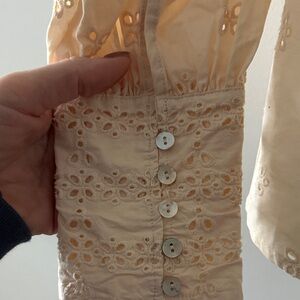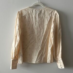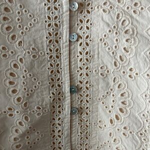Discover elegance with this cream eyelet blouse, perfect for any occasion. measurements length 24 inches, armpit to armpit 21 inches, slave length 25 inches.