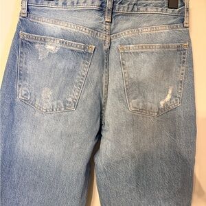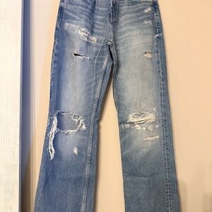 Trendy jeans with distressed details. Light blue color. Ideal for casual wear.
