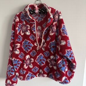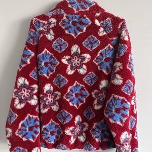 Cozy teddy jacket with striking red and blue floral design. Perfect for a stylish, warm look.