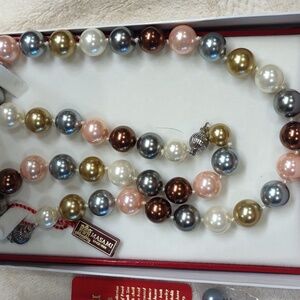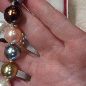 Elegant necklace set featuring multicolor pearls. Perfect for adding a touch of sophistication to any outfit. comes from a smoke-free home and new and box. they are 26 in long. and about 14 to 15 mm in size. the pearls are pink, Gray, a gold yellow color, white and there's also a Bronze color. they come with a pair of Gray or silver color studs. they are new in box. came from my mother's house. has a sterling silver closure. they are multicolored freshwater pearls. just thinning out a bit. please check out my other items and bundle up for discounts