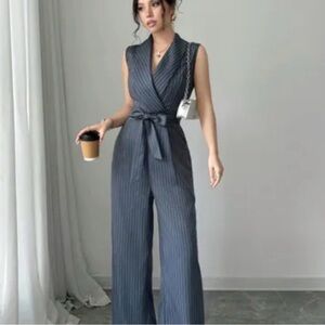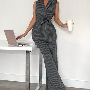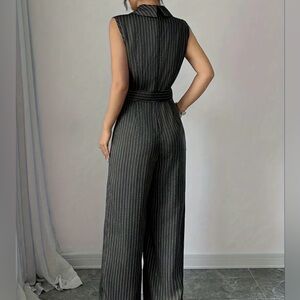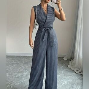 Sleek and sophisticated, this sleeveless striped jumpsuit features a defining belt and a wide-leg silhouette.
