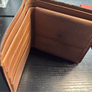 Elegant bifold wallet with classic monogram. Rich brown leather with gold accents. Callouts in photos!