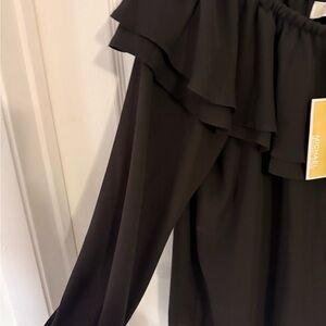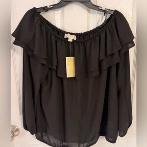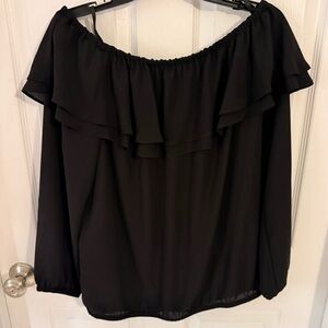 Chic black blouse with ruffle detail. Off-shoulder design. Perfect for versatile styling. Never worn. Brand new and adorable!!