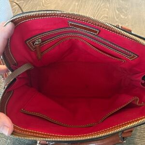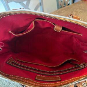 Elegant satchel pair by Dooney & Bourke. Includes one black and one white bag. Features brown leather trim. Ideal for any occasion.