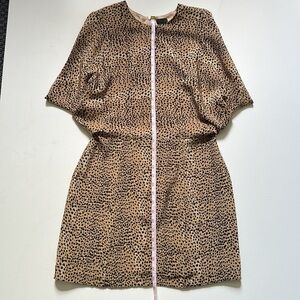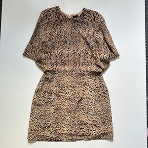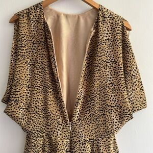 Fully lined silk dress with draped sleeves open from the shoulder. The top half blouses over the skirt which skims the hips. Very sweet flattering dress!