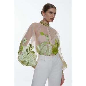 Karen Millen Organdie Applique Buttoned Sheer Long Sleeve Sequined Blouse 4
