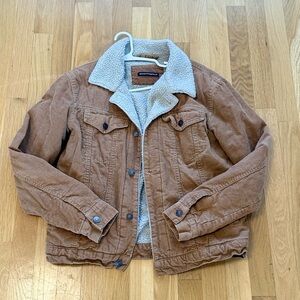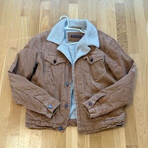 Classic tan corduroy jacket with soft sherpa collar. Ideal for layering. Stylish and comfortable.