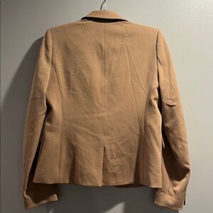 Stylish camel blazer with button closure. Features notched lapels and front pockets.