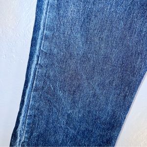 Five pocket styling with button fly closure. Straight leg boyfriend jeans. Dark wash with natural fading and distressing from age. Size 30 waist in men’s with a waist measurement of 27” refer to measurements for proper fit. Note use a pair of a well fitted jeans to compare measurements with similar rise to insure fit.