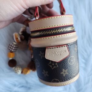 Elegant Coach wristlet in a chic cream color, adorned with gold heart accents. Perfect for adding a touch of luxury to any outfit.