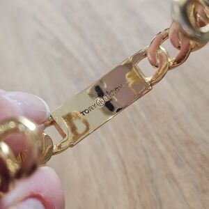 Chic bracelet with gold links and cream enamel. Features iconic Tory Burch logo.
