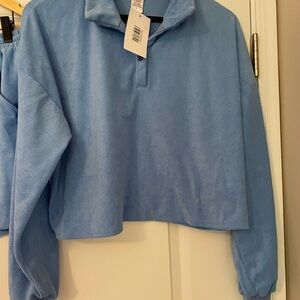 Soft light blue fleece top with a cozy collar. Ideal for casual wear. Both are new with tags. Both are size large.