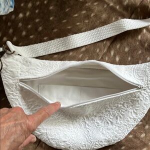 This fun white quilted matellase bag is perfect for any occasion. Made by me, it’s stylish design and neutral white color make it a must-have accessory. Strap adjusts up to 38”. Lined in white cotton with 2 slip pockets inside. Can be used as a crossbody bag OR a fanny pack …. So great when you need to be hands free …. Can be washed in a gentle cycle and air dried … Smoke free and pet free home.
