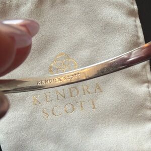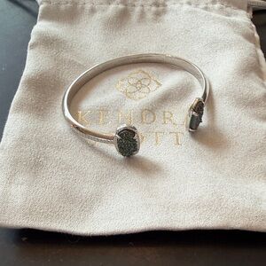 This is a Kendra Scott Silver Tone Cuff Bracelet with gorgeous "Platinum Drusy" stones, these can vary from piece to piece and this particular bracelet has a primary grey coloring with green, blue, and purples that show in the light.