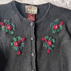 The VTG 80s Susan Bristol Handcrafted Embroidery Wool Floral Cardigan in size S is a vintage piece perfect for a cottagecore style. This tight-knit cardigan features long sleeves, a crew neck, and a button front closure. Hand-embroidered roses, black beads, and greenery add a touch of whimsy to the multicolor design.