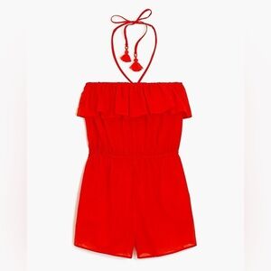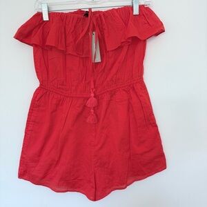 J. Crew Cotton Ruffle Romper Orange NWT Womens Size S Small condition: new with tags color: Cerise red (closer to orange) beach-ready romper in lightweight cotton is perfect for all your warm weather adventures. elastic at top of bodice and at waist lightweigh cotton fabric step into style pockets strapless Cotton. Machine wash.
