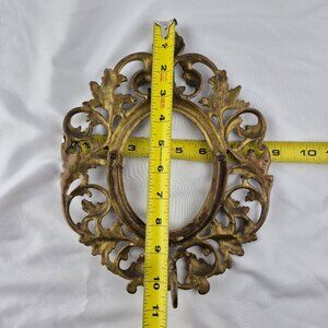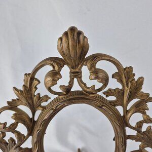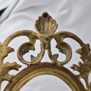 Vintage Oval Brass Ornate Table Top Picture Frame Swivel Easel Stand Scroll Work. Victorian-inspired piece with a light playful Rococo design featuring intricate scroll work with acanthus leaf motifs and a distinct shell embellishment at the top. Swivel easel stand. Nice warm patina to this piece. Numeral embossed on the reverse: 0134. No Glass. Ornate style adds a little glamour to your decor. Picture #2 is taken outside in natural sunlight. Heavy substantial frame. Preowned with normal signs of wear commiserate with age. The picture backing clips/turn buttons have some damage; overall wear, patina. Please see pictures. Please see pictures for approximate measurements. Glamour, vintage, antique, brass, ornate,