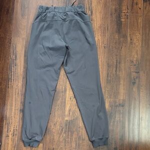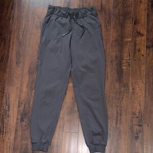 Comfortable charcoal track pants. Elastic waistband with drawstring.