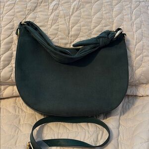 This elegant Nanette Lepore shoulder bag in a rich green hue features a soft suede-like finish and a minimalist design. Its versatile style is complemented by a main shoulder strap and an adjustable crossbody strap, making it perfect for any occasion.