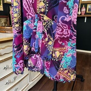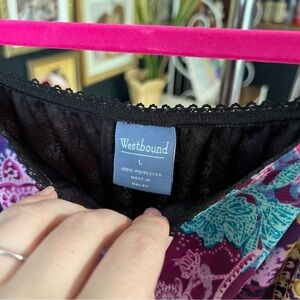Eye-catching skirt with a vibrant patchwork design. Features shades of purple, pink, blue, and yellow.