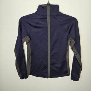 The navy and grey body pairs perfectly with a bold pink zipper accent, offering a sporty yet feminine contrast.