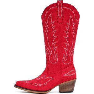 Women Red Faux Suede Retro Snip Toe Chunky Block Heel Embroidered Western Boot