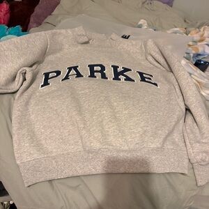 Authentic NEW Parke mock neck sweatshirt Gray with Navy lettering. Gorgeous perfect for casual outings. If you love Parke then you know how impossible it is to get your hands on one.. I have several in my listings all authentic (check my listings and snag yours) I will provide proof of authenticity if requested. I will be posting a couple more soon (trying to decide which one to keep)