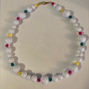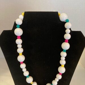 Vibrant beaded necklace with white, pink, yellow, and teal beads. Perfect for adding a pop of color to any outfit.