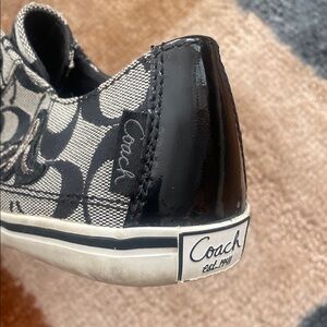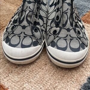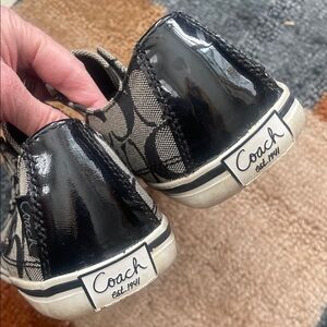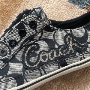 Trendy Coach slip-on sneakers. Features a bold black and gray pattern.