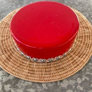 Sweet vintage drum in good condition with all rivets intact - painted wood and natural hide. measures 6” diameter.
