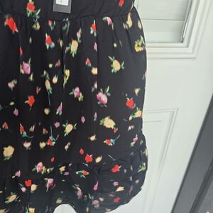 Chic black dress with colorful floral pattern and delicate lace trim. Perfect for any occasion.