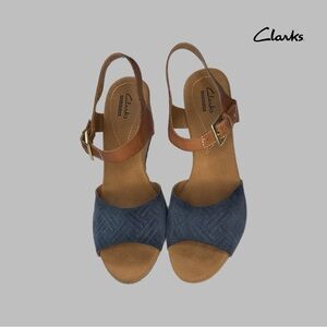 Clarks Collection Sandals Cork Wedge Open Toe Ankle Straps Blue Tan 9.5