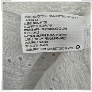 Charming white blouse with eyelet design. Features ruffle sleeves and tie neckline. Ideal for a feminine touch.