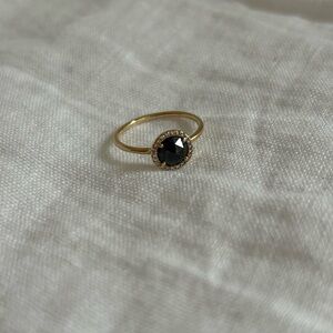 The Aura Rose Cut Black Diamond Ring made by Blanca Monrós Gómez features a stunning rose-cut black diamond as the center stone, encircled by a halo of pavé-set white diamonds on a delicate band. Stacks beautifully with almost any band.