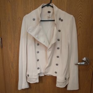 Free People "We The Free" Majorette Military Knit Jacket. This military-inspired jacket features a double-breasted button front with filigree crest buttons and a stand-up collar. Hook closure at neck, laces up back and sleeves, and soft steetchy lining.