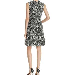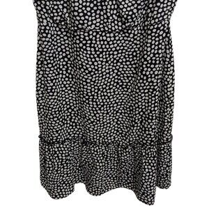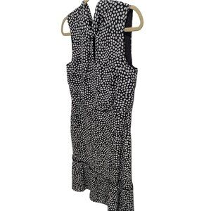 Knee length black and white polkadot dress. Round neckline with slightly ruched front and keyhole opening. Darted bust with defined waistline, sheath silhouette and slight ruffled hemline. Fully lined with a concealed back zipper.