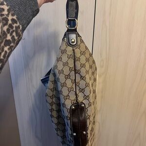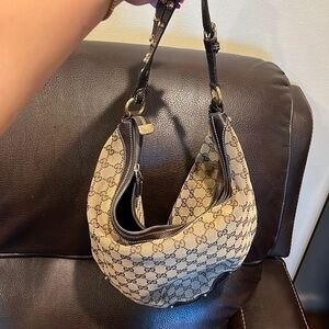 Classic Gucci monogram hobo bag. Can’t find it in stores. Dark brown leather detail. Top zipper and one spacious compartment. Great used condition.